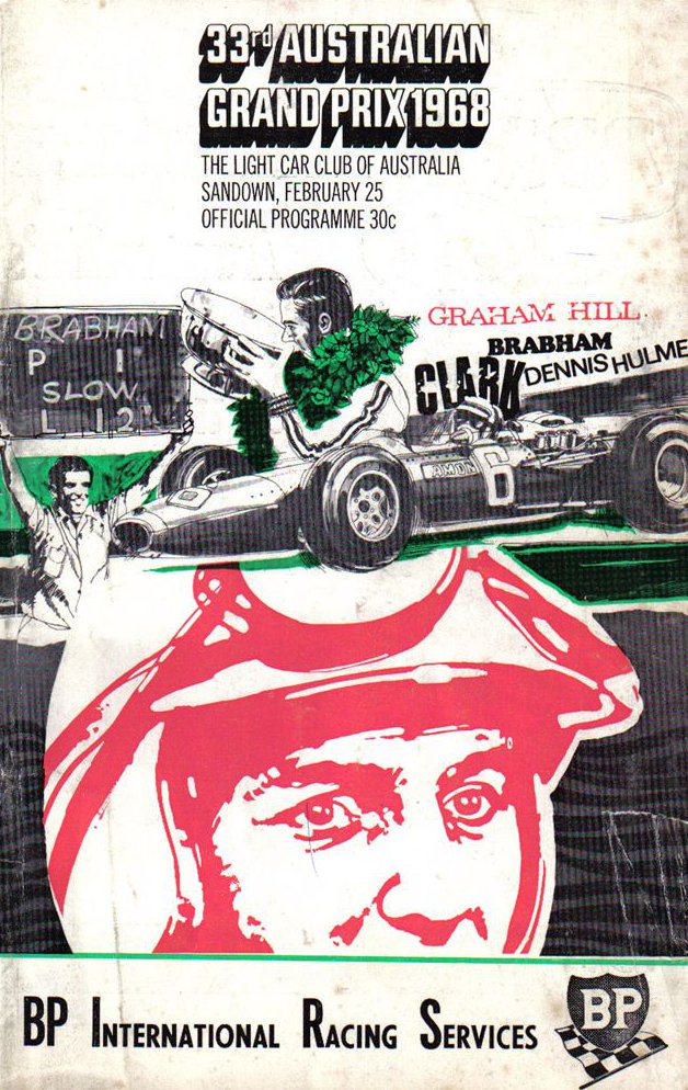 Jack Brabham was all set to win his fourth Australian Grand Prix. Since Warwick Farm his new tyres and new motor had arrived. The motor was still the single overhead-cam type but the block was 11.4 inches shorter and was cast in magnesium. It made the Brabham look much neater as the exhaust system was of the “old fashioned” type, coming out low on the outside of the Vee.